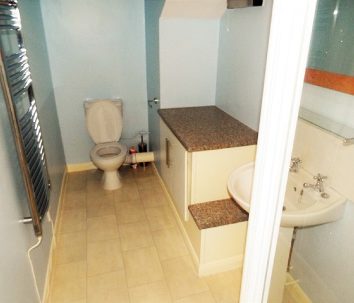 Excellent sized shower room, white low level w/c and sink, chrome heated towel radiator, electric shower, tile effect vinyl flooring.