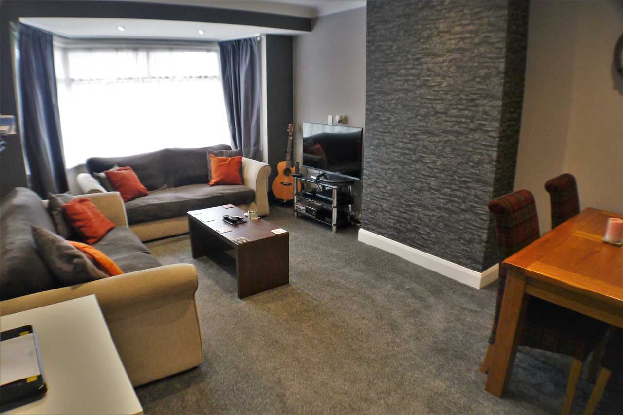 Large south facing lounge/dinner, grey fleck carpet. Grey walls with feature brick effect chimney breast. White skirting boards and ceiling. double glazed uPVC bay window. 18 spot lights and 3 dimmer switches to control different areas of the room.