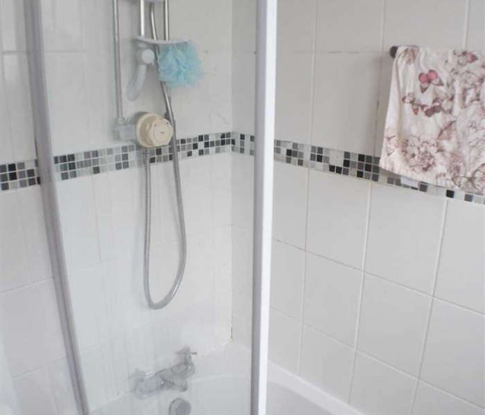 Full white bathroom suite with white tiles and grey mosaic boarder. Chrome effect heated towel rail, white units and mirrored vanity unit. uPVC double glazed window and led spot lighting.