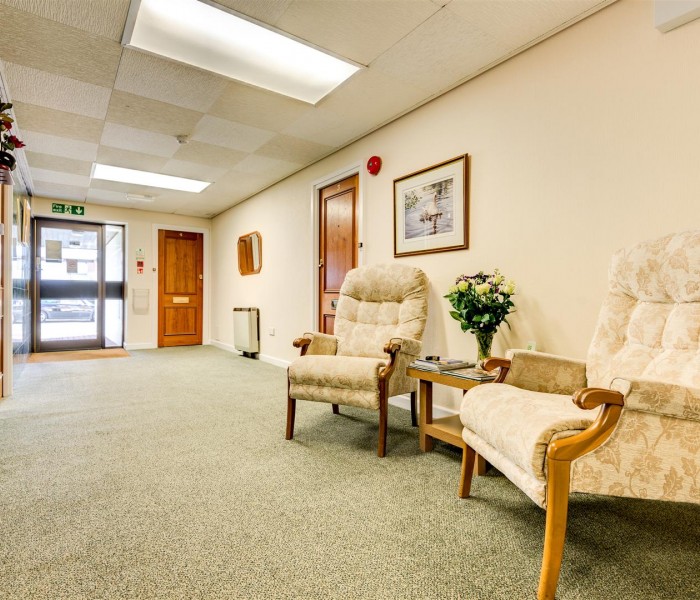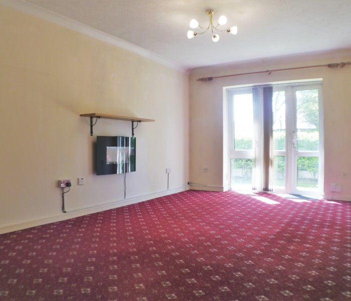 Good size lounge with electric modern fire place, carpeted, neutral decor, upvc double glazed window and door to the south facing communal garden, one electric heater.