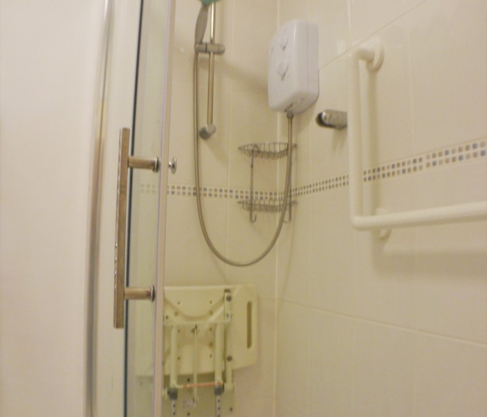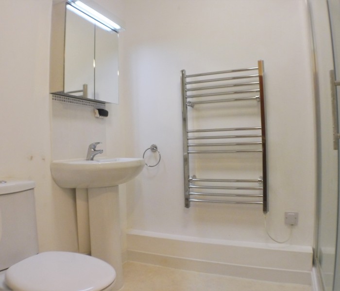 Full white bathroom suite, part tiled, large modern walk in electric shower, chrome heated towel rail, extractor fan, vinyl flooring.
