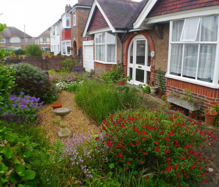 Path entrance either to the left or right garden, mostly shingle to the centre surrounded with a good mixture of shrubs and flowers.
