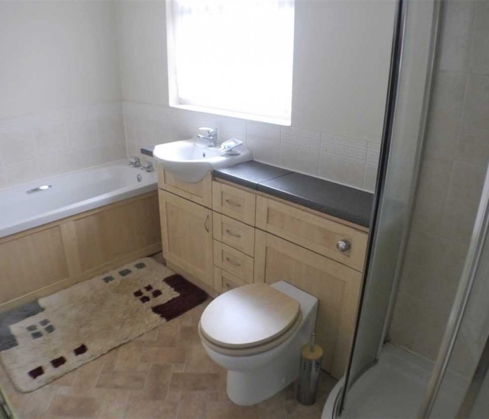 Neutral good sized bathroom with separate mixer shower, uPVC double glazed window, neutrally decorated, vinyl flooring, white bathroom suite, 3 x spot lights.