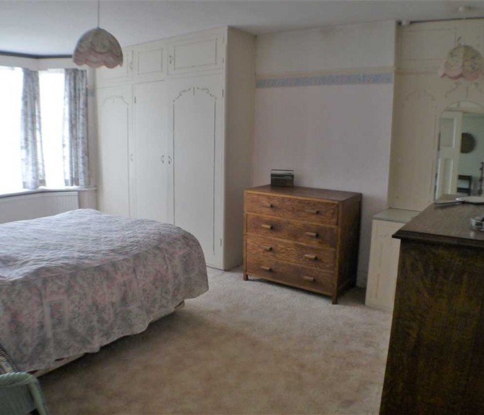 Really generous double bedroom, double glazed bay window, sink, carpeted, built in triple wardrobe, radiator, original door.