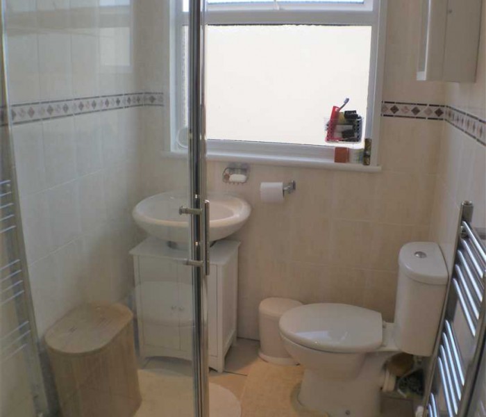 Large walk in shower wet room, rainfall mixer shower, white w/c and basin, storage cupboards, uPVC double glazing, chrome towel radiator.
