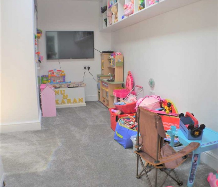 Great sized play room, well lit via the skylight, a recent addition to the property, white walls and deep pile grey carpet.