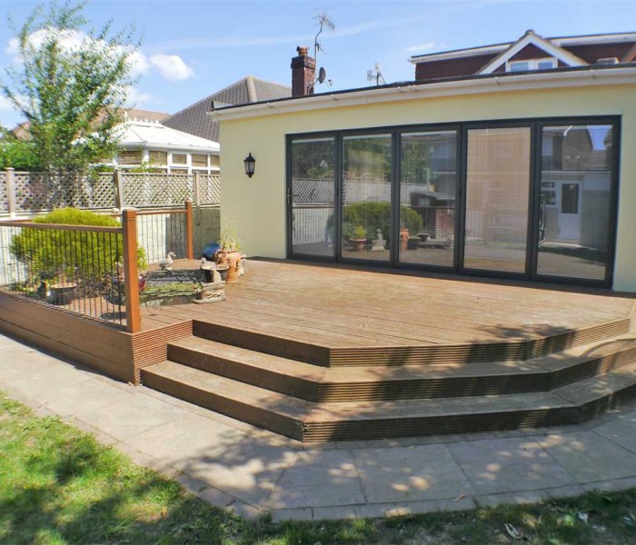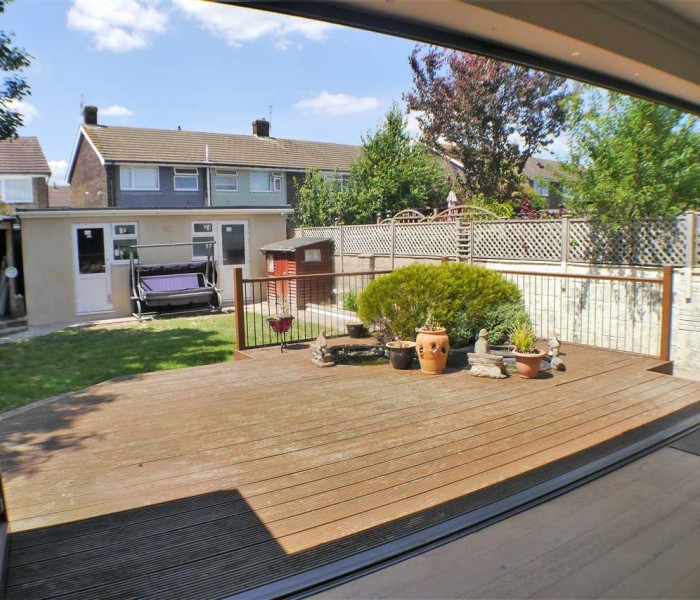 Good sized west facing garden, mostly laid to lawn, with paths to the borders and trees and plants to the south side of the garden. Raised decked area with pond, could easily house a hot tub instead! Side access to the front drive, mains water tap, external power.