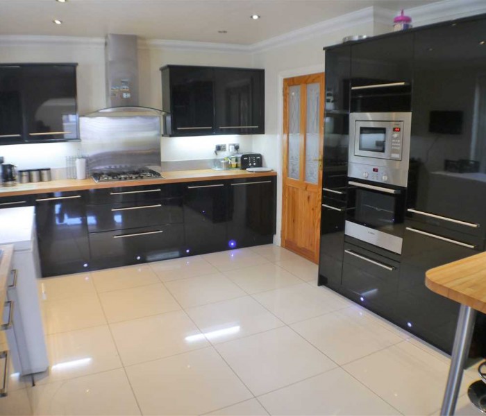 Fantastic sized kitchen, gloss black units with plenty at eye level and base level with natural wood work tops. Fully equipped with 5 ring gas hob, stainless steel extractor, raised elec oven, microwave, dishwasher, 1 1/2 sink and drainer, fridge and 2 freezers, tiled flooring with under floor heating, spot lit direct access outside via uPVC double glazed door.