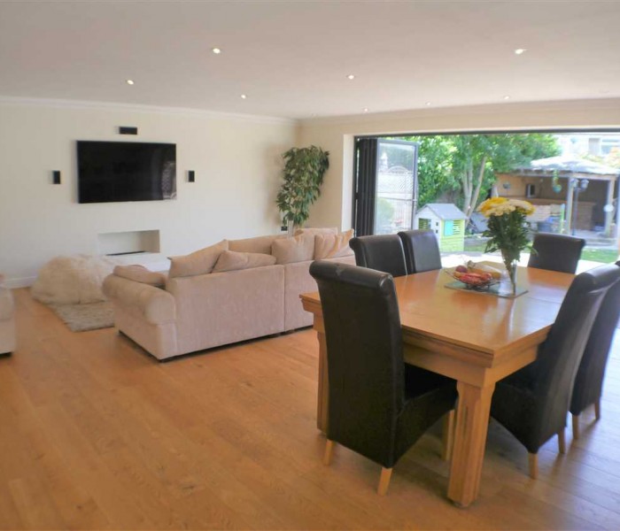 Exceptional sized dual aspect living room, superb 5 leaf bi fold double glazed doors that provide access seamlessly to the garden and raised decked area. North facing uPVC window, light wood flooring, spot light, neutrally decorated. Built in speaker system, gas fire place sunk into the wall, under floor heating.