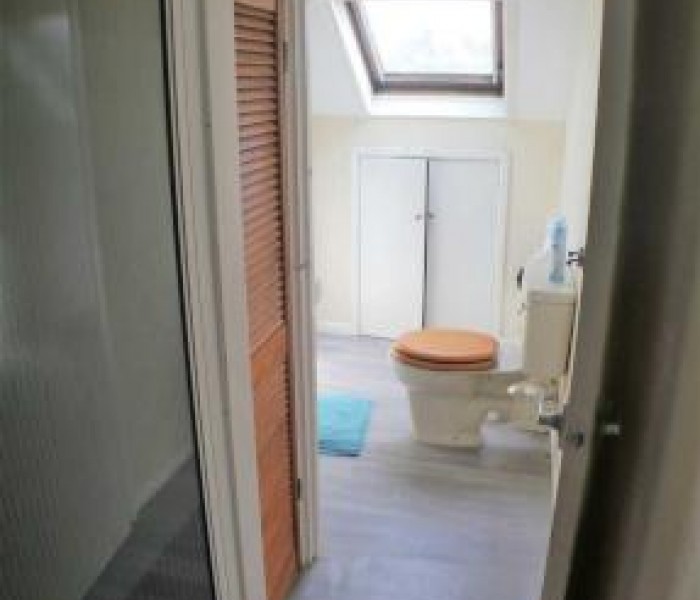 Good sized showeroom. Part tiled, electric shower, laminate wood effect grey floor, double glazed velux window. built in storage cupboard plus eves storage.