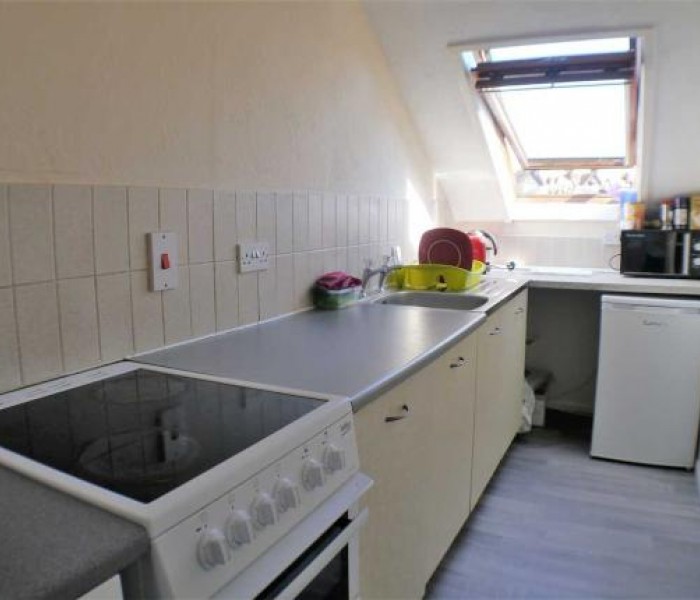 Part tiled kitchen with velux double glazed window. Spot lit. Grey wood effect laminate floor. 4 ring electric cooker. Stainless steel sink & drainer.