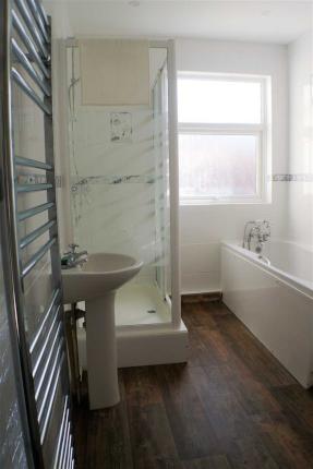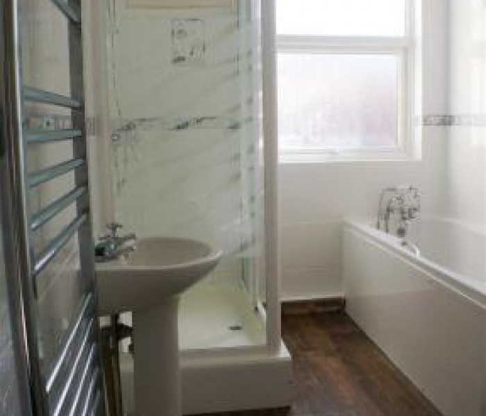 Communal bathroom & shower room. Full white bathroom suite upstairs, separate bath tub, cubical shower, curved basin & WC. Chrome effect heated towel rail. Shower room downstairs, walk in shower, part tiled, WC. Both with wood effect laminate flooring.