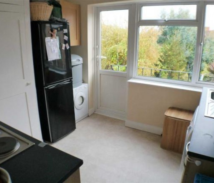 Modern kitchen with plenty of space for a washing machine/ dryer or dish washer. It has a 4 ring electric hob as well as electric oven. Stainless Steel sink and drainer. A large pantry cupboard. Part tiled & laminate flooring. It also has access to the balcony through uPVC double glazed door to the rear of the property.