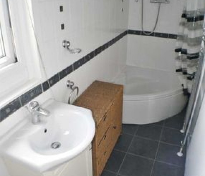 Country style family bathroom, fully tiled walls with slate tile flooring, decorative border, frosted Upvc double glazed window, ceramic hand basin with stylish mixer tap, low level W/C corner bath and shower.