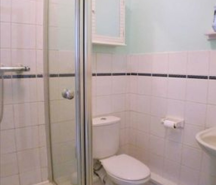 Full white bathroom suite, part tiled walls, new vinyl to be fitted newly painted. Chrome heated towel rail, mixer shower, vanity cupboard.